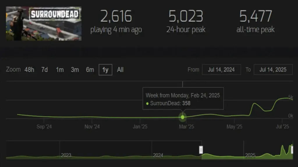 United Gaming – SurrounDead, a post-apocalyptic survival game developed by solo creator Zurvivor, is currently experiencing explosive growth. According to Steam Charts, as of Monday (July 14), the game recorded 2,616 active players, with a 30-day peak of 5,477. This marks a staggering 2000% increase compared to its January 2025 stats—an achievement that deserves attention.